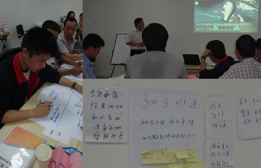 在培訓(xùn)中,祝勇老師分章節(jié)詳細(xì)地講述了管理與領(lǐng)導(dǎo)、溝通理念和方式、激勵(lì)方法與技巧、思維方式等理論。講述圖文并茂,案例豐富,在場的人員都聽得津津有味,并仔細(xì)記錄下對自己有幫助的理論與知識(shí)。培訓(xùn)采用競賽的方式,通過穿插在培訓(xùn)中的小游戲及互動(dòng)環(huán)節(jié),由老師觀察個(gè)小組成員的表現(xiàn)并給予相應(yīng)的積分獎(jiǎng)勵(lì),累計(jì)積分多的小組將獲得后的勝利。每組成員通過激烈的討論將自己的成果分享在教室四周的墻上。